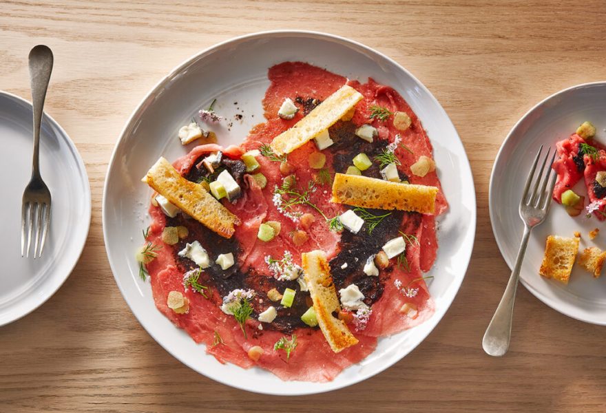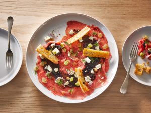 For the main event, this beautiful Beef Carpaccio with a Maple-Black Garlic Paste and Rhubarb not only satisfies the taste buds, but its pink colour matches the Valentine’s theme perfectly.