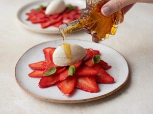 To finish the course, delight your Valentine with a simple but tasty recipe that is light enough for the heat of summer. Our Maple, Strawberry and Basil Carpaccio uses fresh strawberries, golden pure Canadian maple syrup, maple vinegar (trust us) and double cream, mascarpone, maple sugar and vanilla extract for the maple Chantilly. Another beautiful on-theme dish for the day.